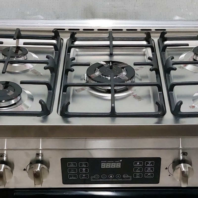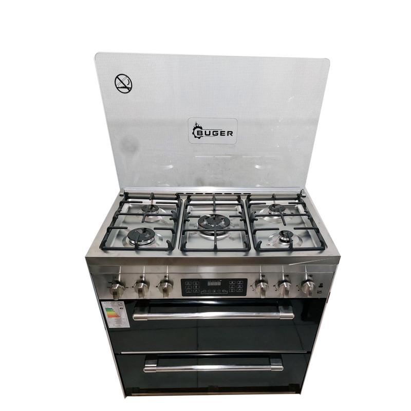 اجاق گاز پنج شعله بوگر تمام استیل تمام ترموکوپل کد910 پلاس تمام ترموکویل(تاپ تایم یا صفرثانیه) گرید انرژی A شاسی دار فندک اتوماتیک تایمر دیجیتالی صفحه استیل از استیل با کد304نگیر خشدار و روکش دار میباشد سایر موارد استیل کاری شده از استیل ضد زنگ با کد 430 خش دار روکش دار میباشد ضمنا این اجاق گاز مجهز به شاسی جدا از بدنه میباشد به طوری که اگر یکی از بدنه ها بر اثر جابجایی آسیب ببیند با کمترین هزینه قابلیت تعویض دارد ولوم های از جنس زاماک یا سرب خشک و دستگیره فلزی ترکیب استیل و آلومینیوم درب پایین کشو دارد و جنس آن از MDFدرجه یک میباشد واز ریل خارجی بهره میبرد.
