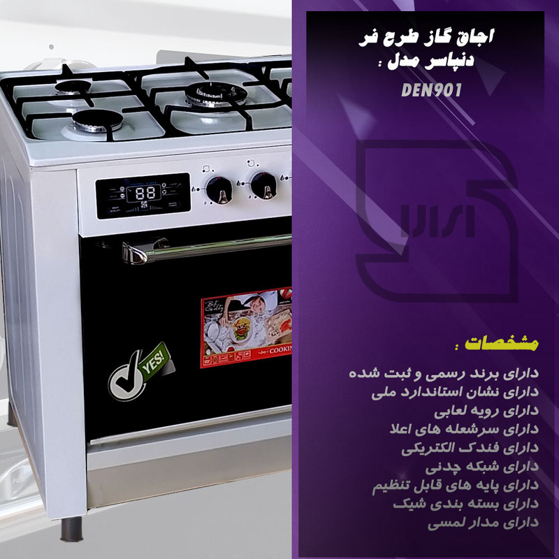 اجاق گار طرح فر5 شعله دنپاسر مدل DEN901 جدیدترین و بروزترین محصول دنپاسر با ظاهری شیک و عامه پسند هست . این اجاق گاز دارای ابعاد 90x60x90 با رویه لعابی مستحکم و چدنی 3 تیکه که کامل بر روی صفحه لعابی قرار گرفته است . همچنین این اجاق گاز دارای فندک برقی -پایه قابل تنظیم- مدار الکتریکی میباشد. این اجاق گاز با برند رسمی دنپاسر و دارای نشان ملی استاندارد می باشد.