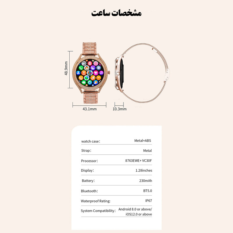 صفحه نمایش رنگی, صفحه نمایش لمسی, کنترل موسیقی (Music Player), قابلیت مکالمه از طریق بلوتوث, پشتیبانی از زبان فارسی در منو و سیستمعامل, قابلیت تغییر طرح ساعت یا تم