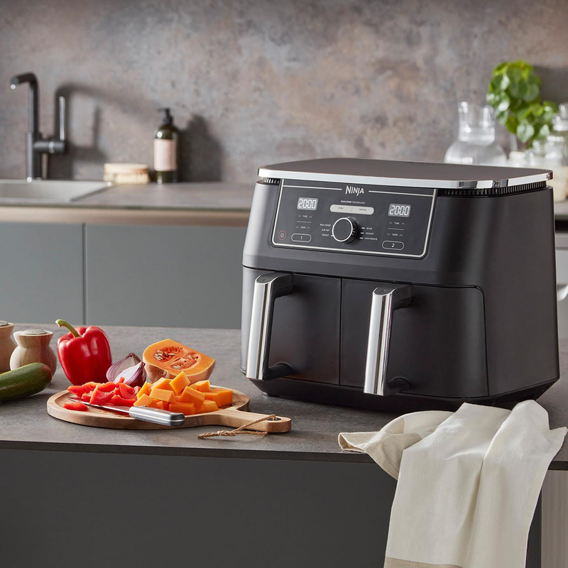 با سرخ کن دو مخزن نینجا دو غذای متفاوت را به دو صورت همزمان بپزید و تمام کنید. نینجا مدل AF400 بیشتر از یک سرخ کن. 6 روش پخت – حداکثر ترد، برشته، پخت، گرم کردن، خشک کن (میوه خشک کن) و هوا سرخ کن. 2 سبد مجزا برای پخت وقتی صحبت از آشپزی می شود، زمان بندی خیلی مهم است. سرخ کن 9.5 لیتری Ninja Foodi زمانبندی را برای شما انجام می دهد. 2 غذای مختلف را با دما و زمان مختلف تنظیم کنید و در 2 سبد پخت و پز جداگانه بپزید – و با استفاده از ویژگی SYNC هر دو را دقیقاً در یک زمان آماده سرو کنید. برای پخت سینه یا بال مرغ و سیب زمینی ترد، ماهی سالمون پخته و سبزیجات مدیترانه ای یا همبرگرهای آبدار گوشت گاو و چیپس طلایی فقط فشار چند دکمه نیاز است . آشپزی برای دو سلیقه غذایی متفاوت؟ با پختن غذای گیاهی در یک کشو و گوشت در کشوی دیگر، برای هر سلیقه آماده باشید. همخوانی داشتن آشپزی برای مهمانان اضافی یا غذا دادن به کل خانواده؟ از ویژگی Match برای دوبرابر کردن حجم سرو خود با برنامه پخت و زمان یکسان در هر دو کشو استفاده کنید. یک غذا را در هر دو سبد بپزید تا دو برابر مقدار غذا در همان زمان درست شود! یا به راحتی دو غذای مختلف را با دستور پخت یکسان بپزید. هر کشوی 4.75 لیتری نچسب و قابل شستشو در ماشین ظرفشویی تا حدود 1.8 کیلوگرم سیب زمینی سرخ شده را می‌سازد. حداکثر ترد یا Max Crips – مواد غذایی را مستقیم از فریزر خارج کنید و بدون معطلی بپزید. در دمای 240 درجه سانتی گراد، غذاهای منجمد مورد علاقه شما را به طور یکنواخت بپزید و ترد کنید. ازمرغ کبابی ، اسکمپی و ناگت مرغ نان گرفته تا سیب زمینی سرخ کرده طلایی، حلقه های پیاز و غیره. مناسب برای شام های سریع و خوشمزه. پخت – به راحتی کیک ، پای و خوراکی های شیرین خانگی، از کلوچه و براونی گرفته تا کلوچه لذت ببرید. میوه خشک کن Dehydrate – تنقلات میوه خشک خوشمزه، از سیب گرفته تا انبه، موز تا آناناس را خشک کنید. از چیپس سبزیجات خانگی، گوشت گاو و حتی سبزیجات خشک شده خود لذت ببرید. دوباره گرم کنید – با کمک این برنامه باقی مانده غذا را مجدد گرم کنید تا طعم و ظاهر پخت اول را داشته باشد . کنترل پنل دیجیتال با کاربری آسان با تایمر شمارش معکوس به شما کمک می کند تا ببینید چقدر زمان پخت باقی مانده است.