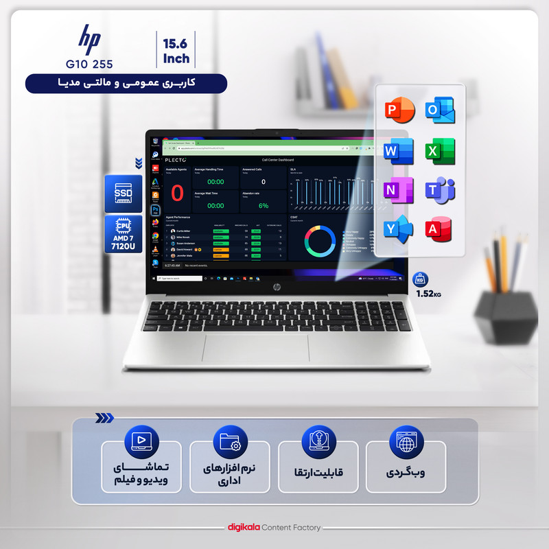 لپتاپ اچپی G10 255 با پردازنده نسل هفتم AMD Ryzen از دسته مدلهای اقتصادی این برند محسوب میشود که برای استفاده روزمره و کاربری عمومی کاملاً مناسب است. این لپتاپ اقتصادی ۱.۵۲ کیلوگرم وزن و ۱۸.۶ میلیمتر ضخامت دارد تا قابلیت حمل بالایی داشته باشد. صفحهنمایش مات ۱۵.۶ اینچی TN این لپتاپ اقتصادی ویژگیهایی چون رزولوشن Full HD، روشنایی ۲۵۰ نیت و نرخ نوسازی تصویر ۶۰ هرتز را با خود یدک میکشد. کیبورد فولسایز مجهز به نامبرپد، تاچپد با پشتیبانی از چند لمس همزمان و ژستهای لمسی ویندوز، وبکم با وضوح HD 720p و دو عدد بلندگوی داخلی استریو نیز از دیگر مشخصات آن در این بخش بهشمار میروند.