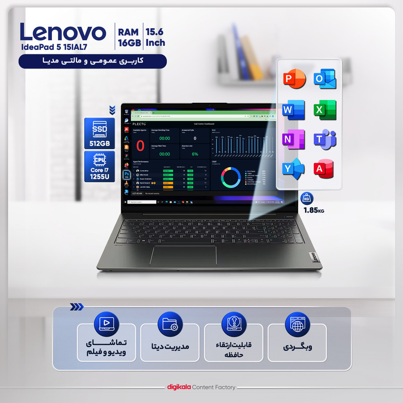 لپ تاپ مدل IdeaPad 5 15IAL7 لنوو، از جمله محصولات این شرکت است که به واسطهی ویژگیهای خود میتواند گزینهای عالی برای انجام امور روزمره باشد. این لپ تاپ به پردازندهی مرکزی Core i7 1255U شرکت اینتل مجهز شده است و این پردازنده با 10 هسته، 12 رشته، 12 مگابایت حافظه کش و فرکانس نهایی 4.7 گیگاهرتزی خود عملکردی قابل قبول در انجام پردازشهای سنگین خواهد داشت. لازم به ذکر است که برای این لپ تاپ 16 گیگابایت رم از نوع DDR4 با سرعت 3200 مگاهرتز و 512 گیگابایت حافظه پر سرعت SSD در نظر گرفته شده است و در صورت نیاز میتوان حافظهی ذخیرهسازی آن را ارتقا داد. شرکت لنوو برای این لپ تاپ از پردازندهی گرافیکی GeForce MX550 با ظرفیت اختصاصی دو گیگابایت استفاده کرده است و از دیگر ویژگیهای این لپ تاپ میتوان به صفحه نمایش 15.6 اینچی با وضوح 1080p اشاره کرد.