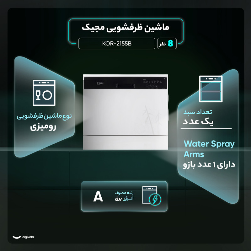 ماشین ظرفشویی «مجیک» مدل «KOR-2155B» یکی از محصولات کارآمد و زیبای ساخت این شرکت است که با ابعاد نسبتا کوچک و جمعوجور خود امکان استفادهی رومیزی دارد. این ظرفشویی ظرفیت 8نفره دارد و به همین خاطر به خانوادههای پرجمعیت توصیه نمیشود. ماشین ظرفشویی مجیک مدل KOR-2155B از برنامههای مختلف شستوشو مانند شستوشوی معمولی، اقتصادی، حساس و شکننده، شستوشوی ظروف کریستالی، شستوشوی سریع و شستوشوی میوه و سبزیجات بهره میبرد. همچنین این محصول دارای قابلیت خشککردن ظروف نیز است. دسترسی به تنظیمات برنامهی ماشین ظرفشویی KOR-2155B از طریق دکمههای پنل تنظیماتی که در قسمت بالای دستگاه قرار دارد، ممکن است و وجود چراغهای نشانگر متعدد، مشاهده و اعمال تنظیمات دستگاه را آسان کرده است. سیستم الکترونیکی تأخیر در شروع زمان شستوشو هم به کمک کاربر میآید تا بتوان با انعطاف بیشتری از دستگاه استفاده کرد. این ویژگی بهخصوص میتواند در ساعتهای اوج مصرف به کمک شما بیاید تا شروع کار دستگاه را برای چند ساعت بعد تنظیم کنید و با تغییر زمان شستوشو بدون نگرانی به کارهای دیگر خود بپردازید. یکی از مزیتهای ماشینهای ظرفشویی رومیزی بینیازی به خمشدن برای گذاشتن و برداشتن ظروف در ماشین است که باعث راحتتر شدن کار با دستگاه میشود. با قرار دادن این ماشین ظرفشویی روی کانتر یا میز و اتصال آن به شیر آب و برقراری سیستم آب خروجی و البته تأمین برق آن، میتوان از قابلیتهای مختلف و کاربردی دستگاه بهره برد.