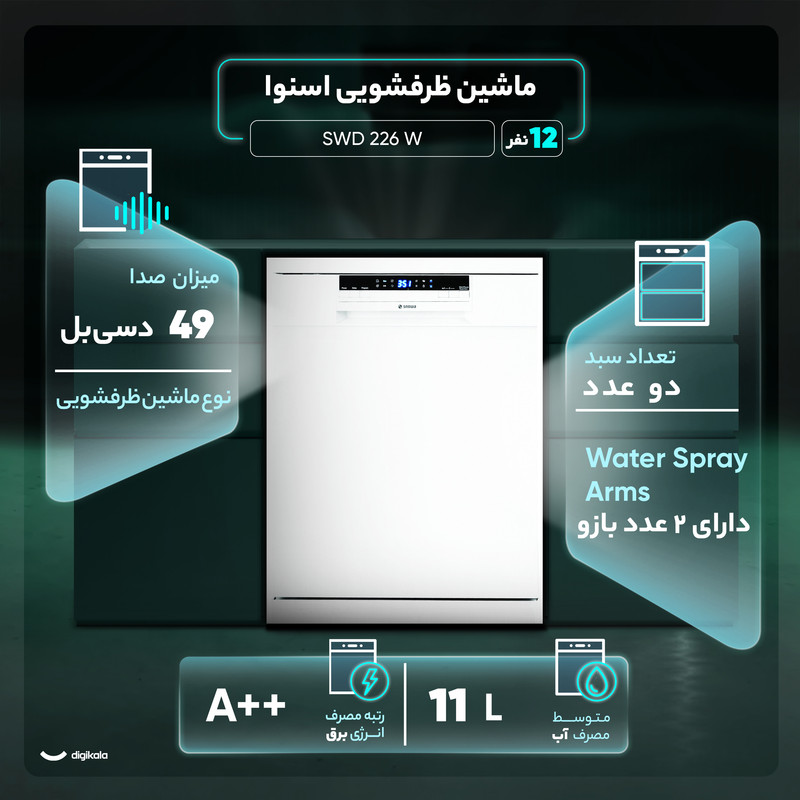 ماشین ظرفشویی اسنوا مدل SWD-226w از جدیدترین مدل ظرفشویی های با کیفیت تولید شده توسط شرکت اسنوا می باشد. بهبود کیفیت و عملکرد دستگاه و طراحی بهبود یافته از مشخصات این محصول به حساب می آید. این محصول توسط متخصصان شرکت اسنوا ساخته شده و تکمیل شده ی مدل قدیمی SWD-148 می باشد. ظرفشویی 226 اسنوا با ظرفیت بالا و از نظر شمارش 12 نفره می باشد و ایده آل برای خانواده های پر جمعیت به حساب می آید و شما را از استفاده چند باره از دستگاه بی نیاز می کند.