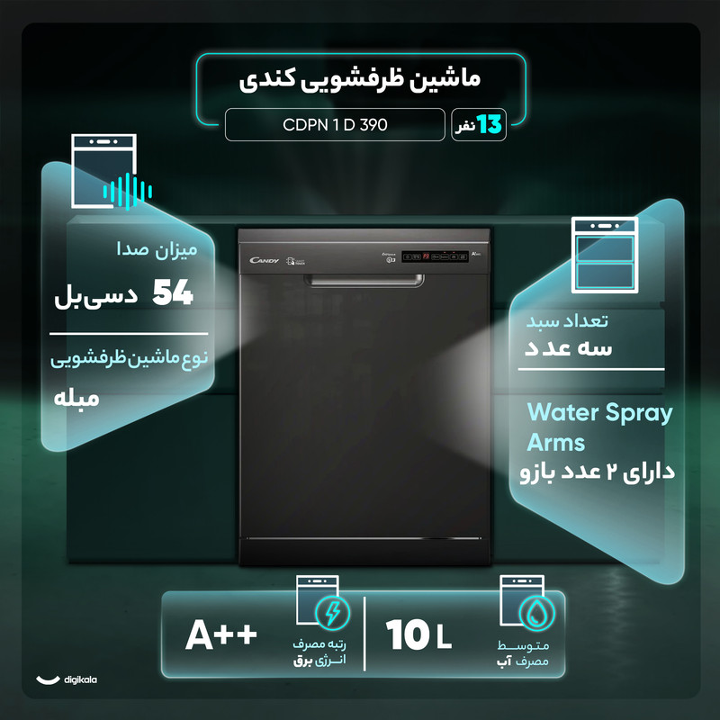 امروزه ظرف شستن کار طاقت فرسایی نیست، با استفاده از ماشین ظرفشویی میتوانید این کار را به آسانی و بهترین شکل ممکن انجام دهید. اگر به دنبال یک ماشین ظرفشویی با کیفیت میگردید ماشین ظرفشویی کندی CDPN 1 D 390 کی از گزینههای شماست. این ماشین ظرفشویی مبله ظرفیتی دارد که میتواند بشقاب و لیوان استفاده شده توسط 13 نفر را در خود جای دهد و با کیفیت بالا بشوید. این مدل با 600 میلی متر پهنا، 600 میلی متر عمق و ارتفاع 850 میلی متر به بازار عرضه شده است. این مدل برای خانوادههای پرجمعیت انتخاب مناسبی است. میزان نمودار مصرف انرژی ماشین ظرفشویی کندی مدل CDPN 1 D 390 ، A+ است. متوسط میزان آبی که در هر شست و شو برای مصرف میشود 10 لیتر است. با 9 برنامه شستشویی که برای این مدل در نظر گفته شده، کار با این ماشین را آسانتر میکند. از دیگر ویژگیهای این مدل میتوان به، نمایشگر میزان نمک، دارای سیستم جلوگیری از نشت آب ، دارای تکنولوژی NFC اشاره کرد. این محصول از محفظه استیل ضد زنگ استفاده کرده است. سبد بالایی در این مدل قابلیت تنظیم دارد.