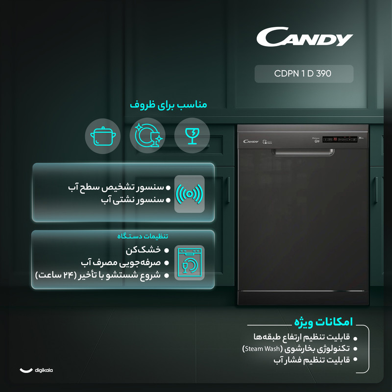 - برنامههای شستوشو: شستوشوی سریع (Quick Wash), شستوشوی اقتصادی (Eco Wash), شستوشوی شدید (Intensive Wash), شستوشوی خودکار (Auto Wash), شستوشوی ظروف حساس (Delicate Wash), شستوشوی قابلمه و تابه (Pots & Pans Wash)