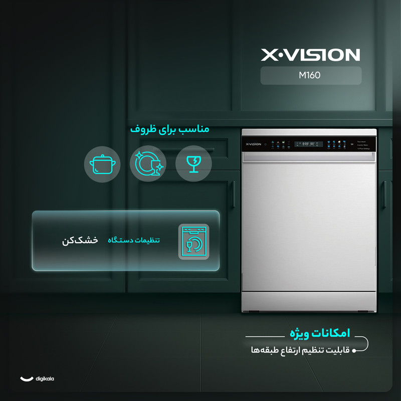 ماشین ظرفشویی 14 نفره ایکسویژن مدل M160 با طراحی مدرن و ویژگیهای پیشرفته، یکی از بهترین انتخابها برای خانوادههای پرجمعیت و میزبانهای حرفهای است. این مدل با ابعاد استاندارد (ارتفاع 85 سانتیمتر، پهنا 59.8 سانتیمتر و عمق 60 سانتیمتر) بهراحتی در فضای آشپزخانه جای میگیرد. طراحی و ظاهر جذاب این دستگاه به زیبایی دکوراسیون آشپزخانه شما میافزاید.