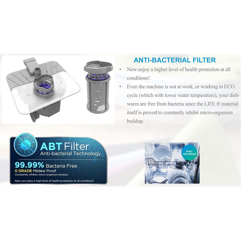 سیستم Eco Mode کاهش مصرف برق/تکنولوژی Smart Inverter برای کنترل دما و فشار آب/فیلتر ABT آنتی‌باکتریال 0 Grade/روشنایی داخلی با لامپ LED/صفحه EasyClean ضدچسبندگی/قابلیت More‑Less جهت کاهش یا افزایش زمان برنامه/سنسور تشخیص کثیفی ظروف/جنس بدنه ضدبو و ضدزنگ