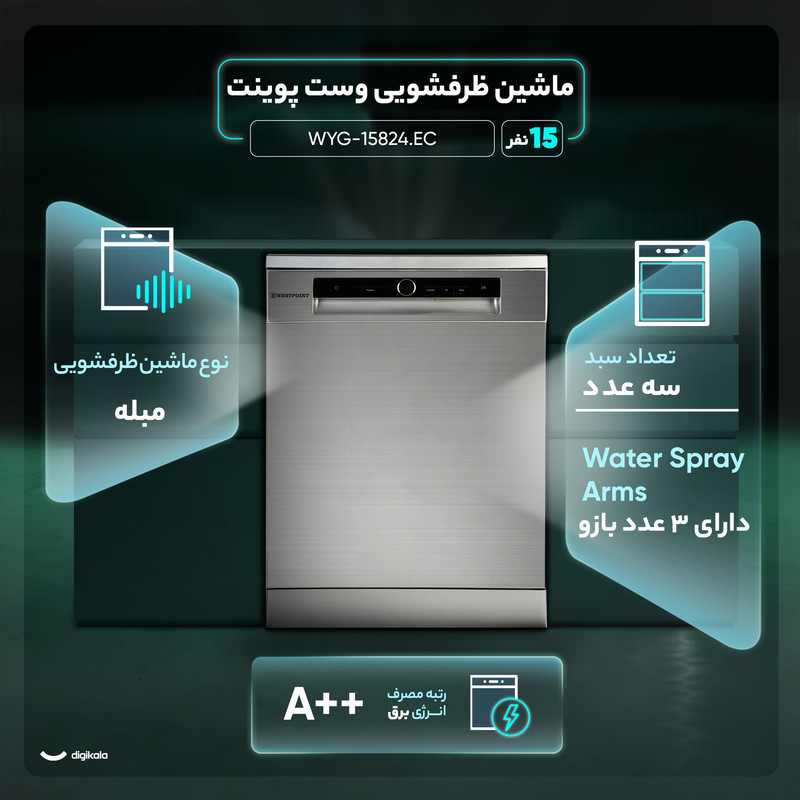 ماشین ظرفشویی ۱۵ نفره وست پوینت مدل WYG-15824.EC با طراحی حرفه‌ای و امکانات کاربردی، گزینه‌ای مناسب برای خانواده‌های پرجمعیت یا کاربرانی است که به دنبال دستگاهی با عملکرد مطمئن، کم‌مصرف و هوشمند هستند. این ماشین ظرفشویی از نوع مبله بوده و با ظرفیت بالای خود، امکان شست‌وشوی هم‌زمان حجم زیادی از ظروف را فراهم می‌کند.