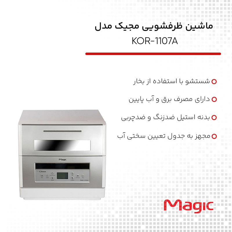 ظرفشویی مجیک مدل KOR-1107A یکی از جدیدترین و پرفروش ترین مدل های ظرفشویی 6 نفره در بازار ایران بوده که توسط کشور کره ساخته شده است. این دستگاه با طراحی توکار خود، زیبایی خاصی را به آشپزخانه شما می بخشد و کابین داخلی و درب استیل ضد زنگ، زیبایی آنرا دو برابر کرده است. این مدل ظرفشویی مجیک با ارتفاع 49 سانتی متر، عمق 44 و عرض 53 سانتی متر تولید شده است.