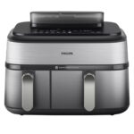 در بخش عملکرد، هواپز 9 لیتر فیلیپس مدل NA555/09 از فناوریهای پیشرفته RapidAir Plus و Air Steam بهره میبرد که ترکیب جریان هوای گرم با بخار را ممکن میسازد. این ساختار نهتنها باعث پخت یکنواخت و سریعتر میشود، بلکه رطوبت داخلی غذا را حفظ کرده و از خشک شدن گوشت، ماهی یا سبزیجات جلوگیری میکند. دستگاه دارای دو سبد مجزا شامل یک سبد ۶ لیتری و یک سبد ۳ لیتری است که امکان پخت دو نوع غذا را بهصورت همزمان و با تنظیم دما و زمان مستقل برای هر محفظه فراهم میسازد. یکی از سبدها مجهز به قابلیت بخارپز است و این ویژگی برای افرادی که به تغذیه کمچرب و سالم اهمیت میدهند بسیار ارزشمند است. وجود ۱۲ برنامه پخت پیشفرض نیز فرآیند آمادهسازی غذاهای متفاوت را سادهتر و سریعتر میکند.