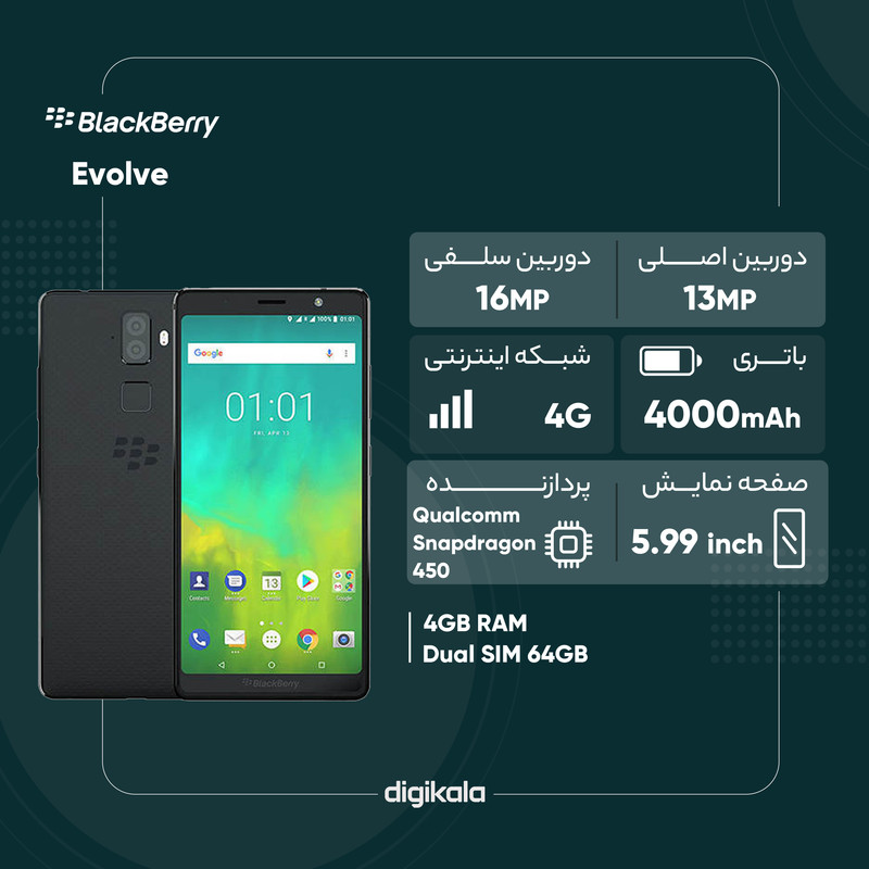 گوشی موبایل «Evolve» یکی دیگر از محصولات اندرویدی بلکبری است که به نسخه 8.1 از سیستمعامل اندروید موسوم به اوریو مجهز شده است. این محصول با داشتن 64 گیگابایت حافظهداخلی، 4 گیگابایت رم، دوربینهای باکیفیت و بدنهای خوشساخت میتواند رضایت کاربران را جلب کند. از مشخصات فنی Evolve میتوان به پردازندهی مرکزی 8 هستهای اشاره کرد که روی تراشهی اسنپدراگون 450 قرار دارد و در کنار 4 گیگابایت رم به پردازش اطلاعات مشغول است. حافظهی داخلی این گوشی 64 گیگابایت است و برای افرادی که میخواهند از ظرفیت بیشتری بهره ببرند، قابلیت ارتقا تا 256 گیگابایت از طریق کارت حافظهی جانبی فراهم شده است. نمایشگر 5.99 اینچی Evolve از نوع «LCD» است و در ساخت آن از فناوری «IPS» استفاده شده است. این صفحهنمایش که قابلیت دریافت چندین لمس همزمان را دارد، رزولوشن 1080×2160 پیکسل و تراکم 403 پیکسل بر هر اینچ را به تصویر میکشد. دو سنسور 13 مگاپیکسلی در قاب پشتی این بلکبری جا خوش کردهاند؛ این دو دوربین با فلشی از نوع LED دوگانه و دورنگ همراه اند تا گوشی در مکانهای تاریک هم بتواند تصاویر مناسبی ثبت کند. دوربین سلفی موشن هم با توجه به دریچهی دیافراگم و همانطورکه گفته شد، نسخهی 8.1 از اندروید اوریو در ایوالو مورد استفاده قرار گرفته که در کنار حسگر اثر انگشت، باتری 4000 میلیآمپرساعتی و امکان شارژ سریع از مهمترین نقاط قوت این محصول است. گوشی Evolve انتخابی مطلوب برای کسانی است که به گوشیهای بلکبری و طراحی منحصربه فردشان علاقهمند هستند.
