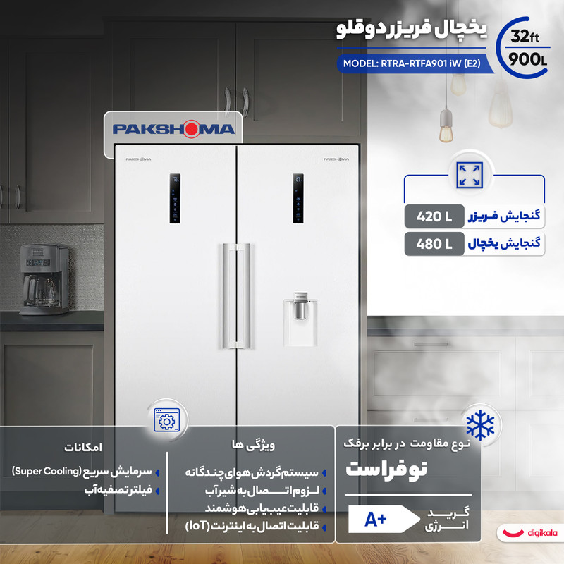 یخچال فریزر پاکشوما مدل RTRA-RTFA901 iW (E2) از نوع دوقلو (Twin Peaks) با گنجایش بسیار بالای ۳۲ فوت (۹۰۰ لیتر) است که آن را برای خانوادههای پرجمعیت مناسب میسازد. این دستگاه از گاز مبرد R600a استفاده کرده و با گرید انرژی عالی A+، عملکردی بسیار کممصرف و بهینه ارائه میدهد.