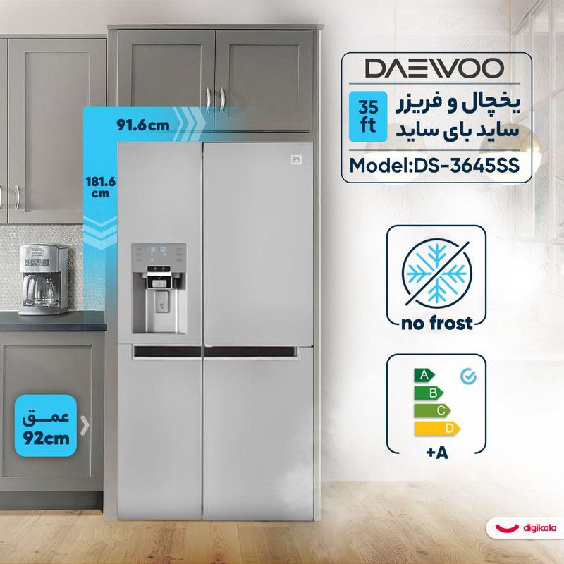 یخچال و فریزر ساید بای ساید دوو مدل DS-3645SS یکی از محصولات پرطرفدار این برند معتبر است که با ظرفیت 35 فوت، فضای مناسبی برای خانوادههای پرجمعیت ارائه میدهد. این دستگاه دارای طراحی مدرن و زیبا است که به هر آشپزخانهای جلوهای خاص میبخشد. یخچال این مدل دارای 494 لیتر گنجایش است و با داشتن چهار طبقه و دو کشو، فضای کافی برای ذخیره مواد غذایی فراهم میکند. همچنین با پنج طبقه درب یخچال، امکان قرار دادن بطریها و سایر اقلام کوچک را بهخوبی فراهم کرده است. سیستم بدون برفک (نوفراست) در هر دو قسمت یخچال و فریزر از ایجاد برفک جلوگیری میکند و نیازی به تمیزکاری دستی ندارد. در بخش فریزر نیز، با داشتن سه طبقه و کشوها، فضای مناسبی برای نگهداری مواد منجمد فراهم شده است. یخساز اتوماتیک این دستگاه که مستقیماً به آب شهری متصل میشود، تجربه راحتتری را در استفاده از یخساز ارائه میدهد. علاوه بر این، نمایشگر دیجیتالی برای کنترل دما و آبسردکن خارجی از دیگر امکانات قابل توجه این محصول است. مصرف انرژی این یخچال در کلاس A+ قرار دارد که نشان از کارایی بالای آن دارد.